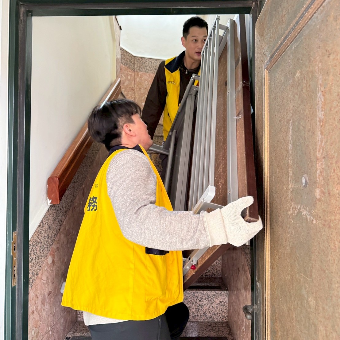 在樓梯間、卡車邊、走廊裡來回接力。