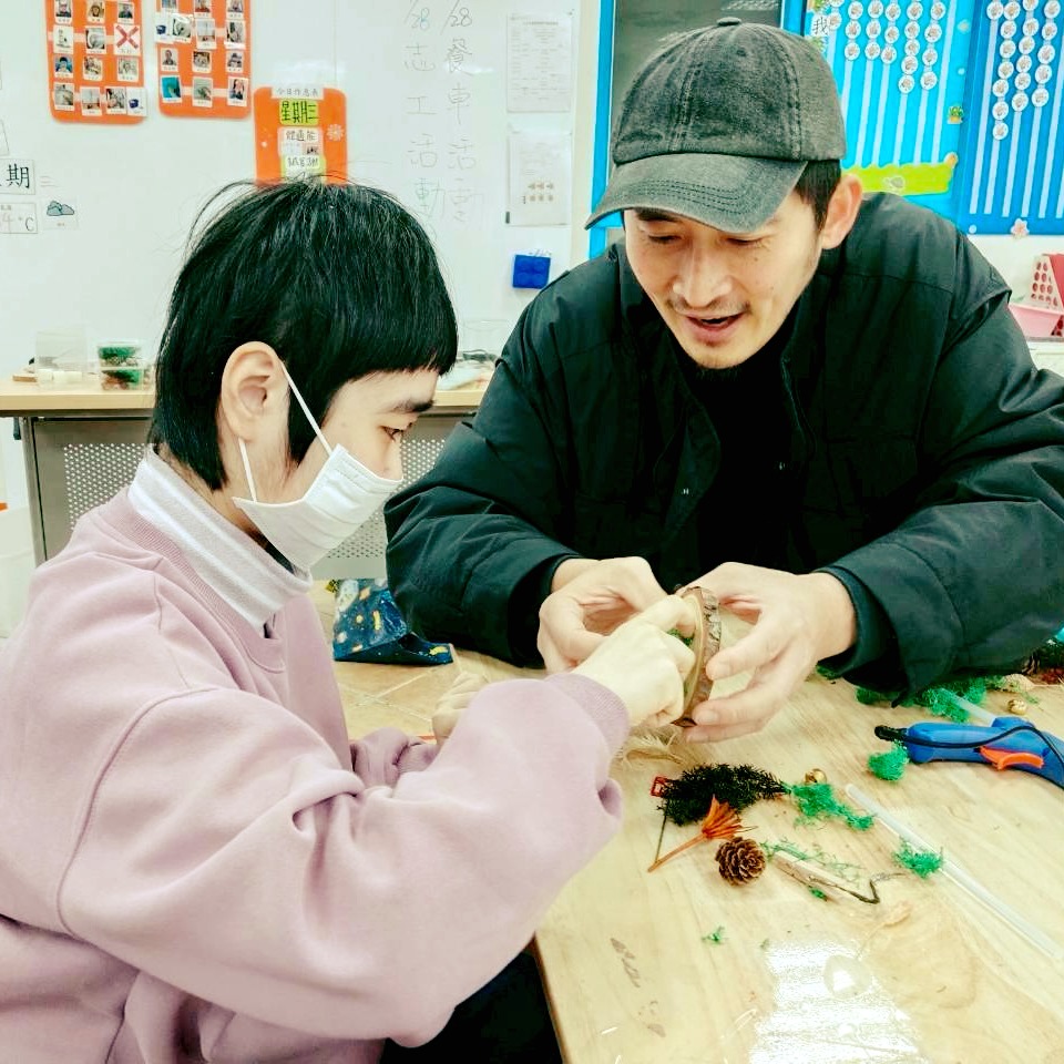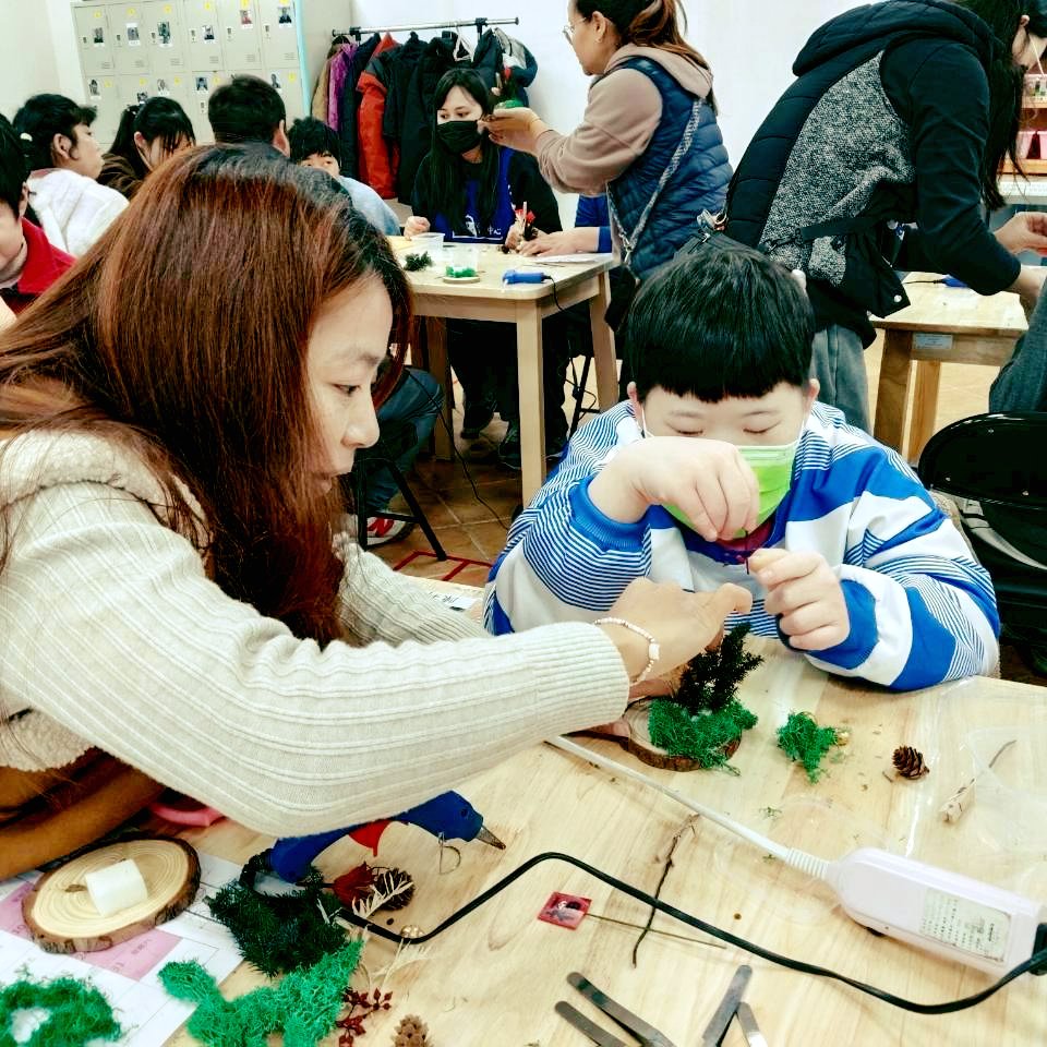 松果、苔蘚、小裝飾,一樣一樣慢慢黏上,志工在旁細心陪伴、一步一步引導,