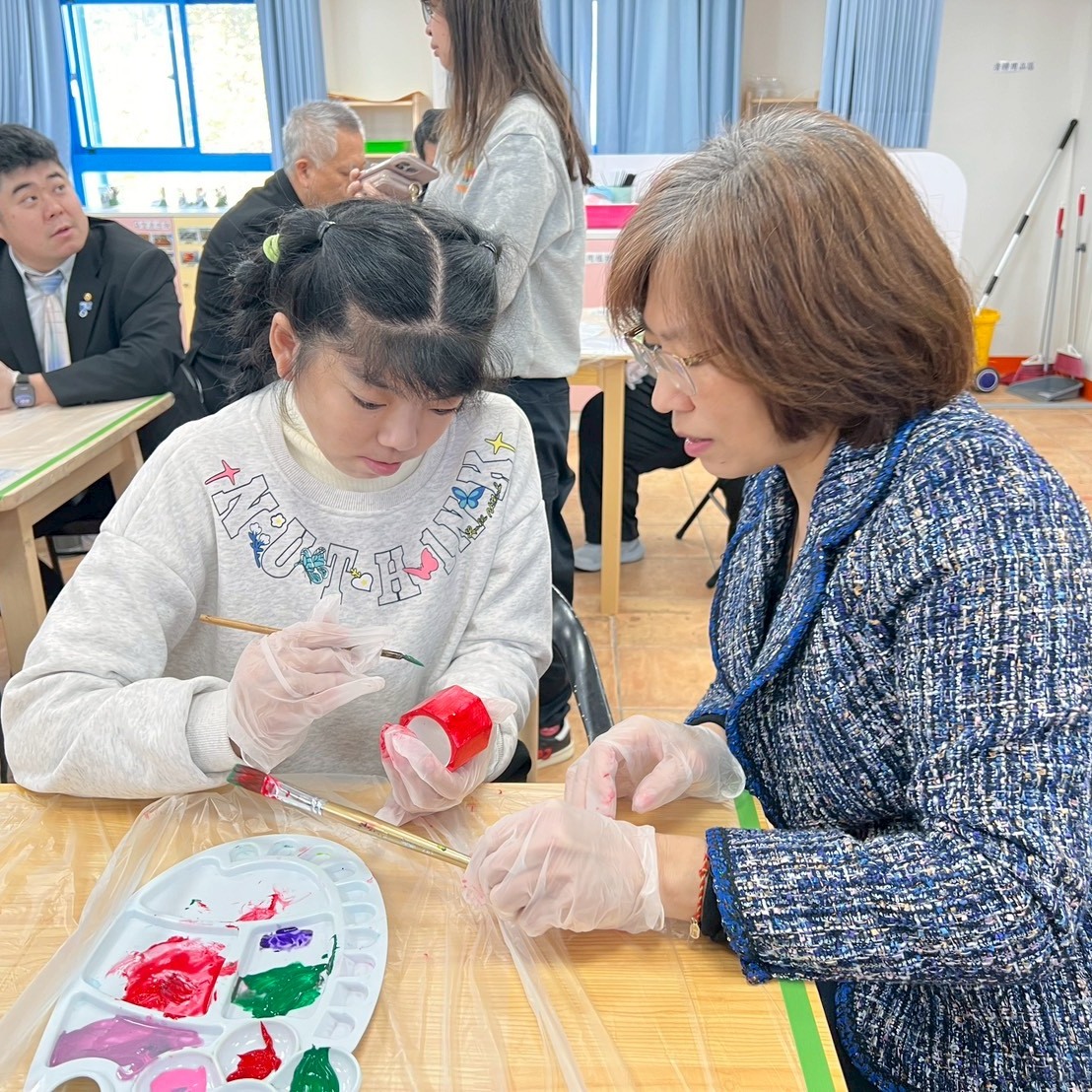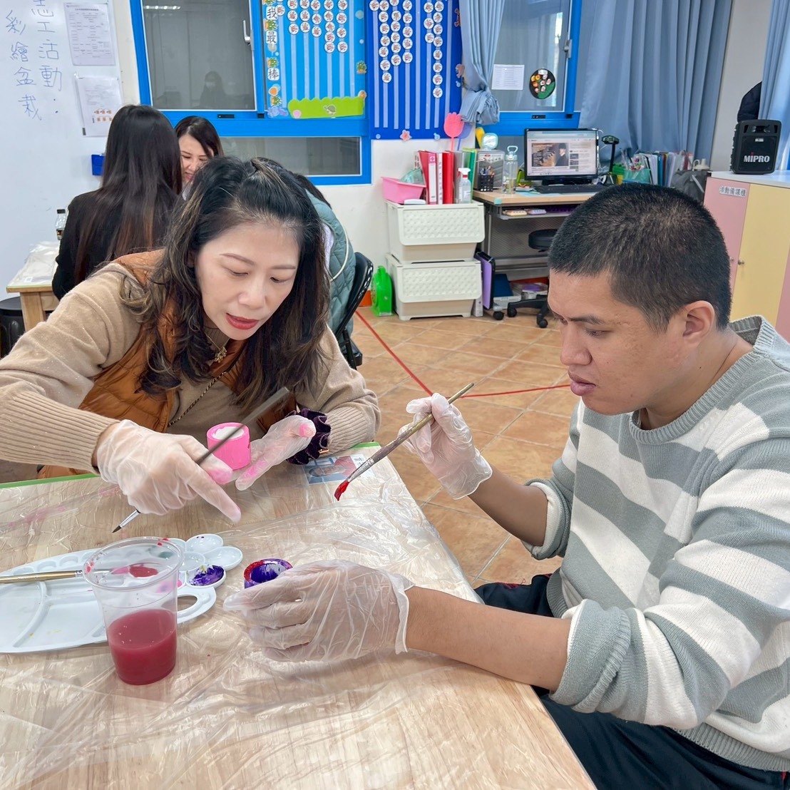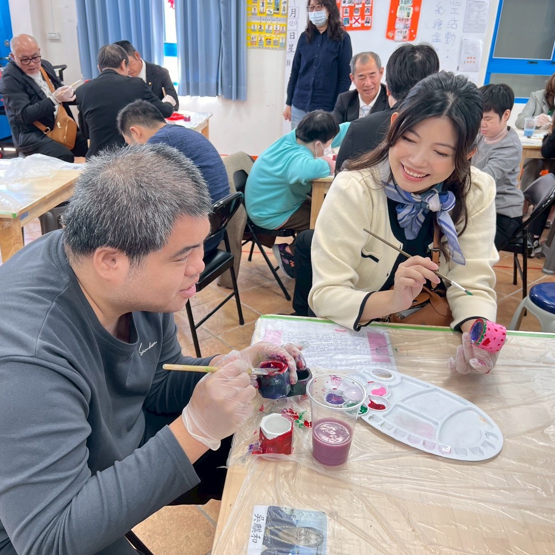 刷子沾上顏料,一筆一畫慢慢完成,院生與扶輪社夥伴並肩而坐,