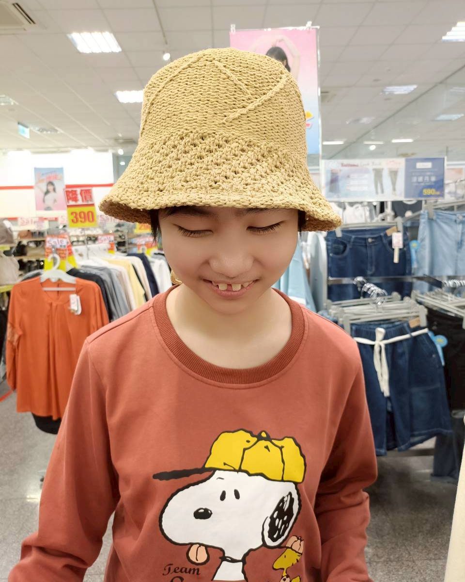 有人開心試戴帽子,露出靦腆又滿足的笑容😊